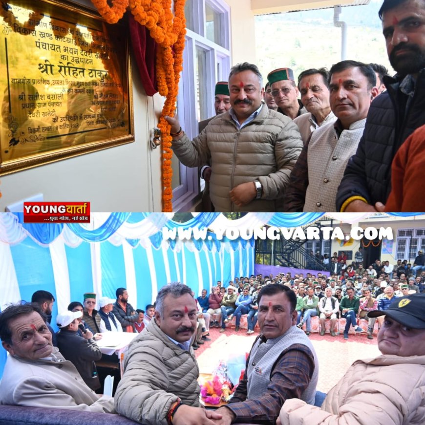 शिक्षा मंत्री रोहित ठाकुर ने आज कोटखाई उपमंडल के अंतर्गत देवरी खनेटी पंचायत घर का लोकार्पण किया, भवन का निर्माण कार्य 14 लाख 80 हज़ार रूपये की लागत से पूर्ण किया गया है। उन्होंने इस अवसर पर स्थानीय नागरिक को नए पंचायत घर के लिए बधाइयाँ दीं और आशा व्यक्ति की, कि इस भवन के निर्माण से पंचायतों के कार्यों मे सुविधा मिलेगी और कार्यदक्षता में बढ़ोतरी होगी। उन्होंने पंचायत भवन के फर्नीचर हेतु 1 लाख रुपये देने की घोषणा भी की। शिक्षा मंत्री ने कहा कि वर्तमान कांग्रेस सरकार प्रदेश के समग्र विकास के लिए प्रतिबद्ध है। इसी प्रक्रिया में विधानसभा क्षेत्र जुब्बल नावर कोटखाई में पिछले करीब 3 वर्षों में चहुँमुखी विकास सुनिश्चित किया जा रहा है।