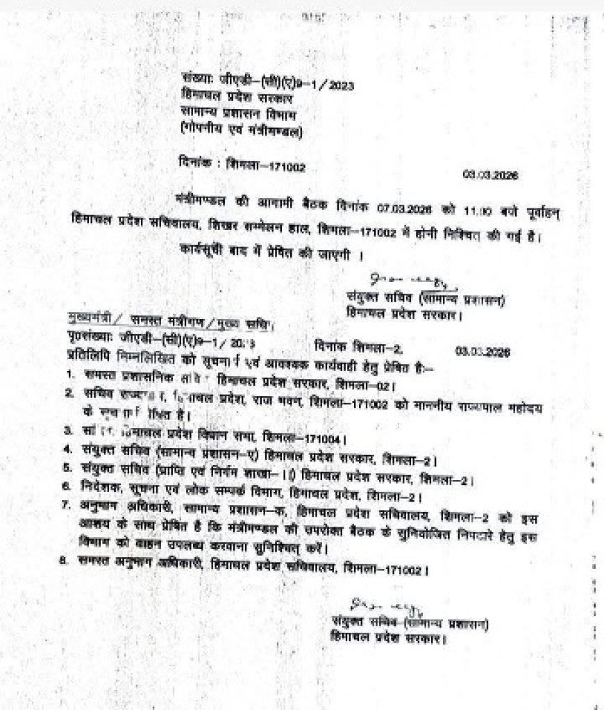 मुख्यमंत्री सुखविंद्र सिंह सुक्खू की अध्यक्षता में सात मार्च को हिमाचल प्रदेश मंत्रिमंडल की बैठक होगी।